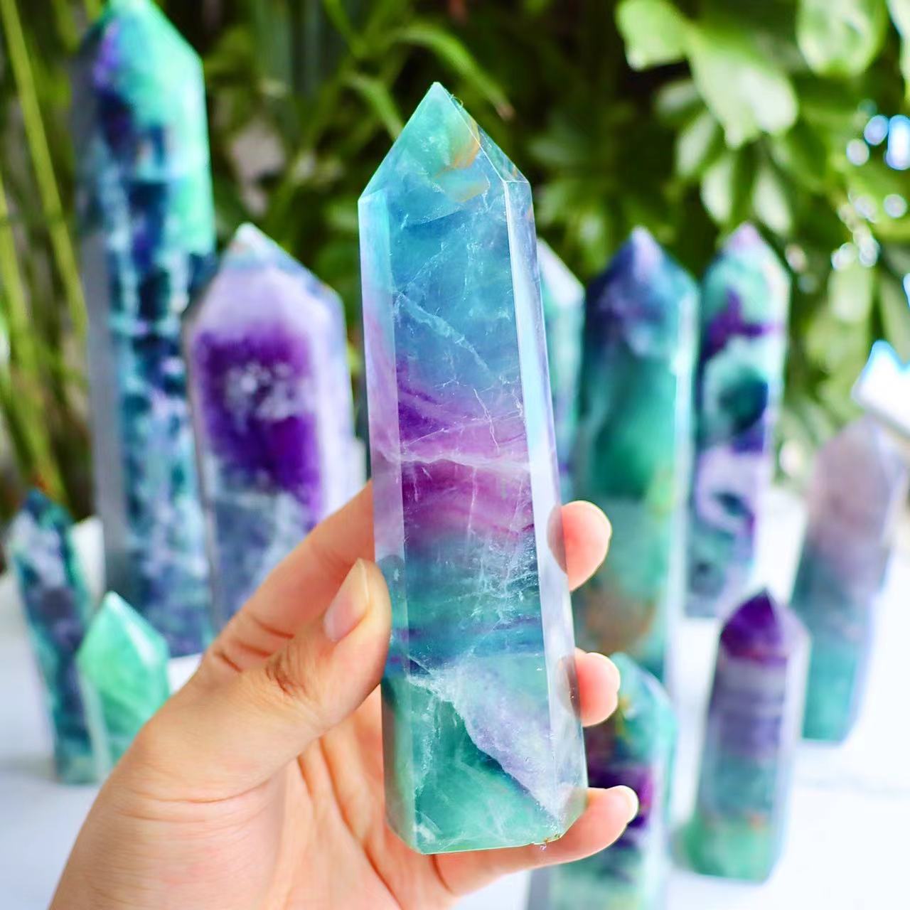 Experience the beauty of this unique Crystal tower-rainbow fluorite big tower. Perfect for wholesale use, the fluorite tower emits a range of vibrant colors, making it a beautiful addition to any home or office. Enjoy the quality of this stunning gemstone for years to come.